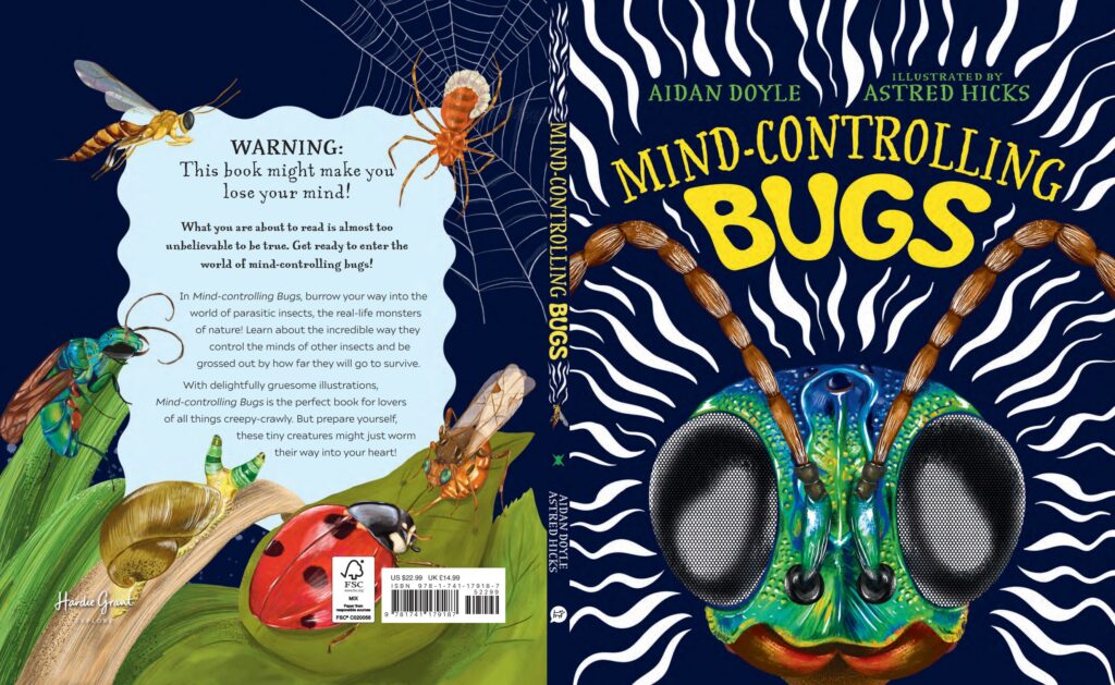 Mind-controlling Bugs is a 48-page illustrated hardback non-fiction book for kids ages 6 and up. It’s filled with fun, creepy facts about weird parasites and real-life zombies. Wasps that turn caterpillars into bodyguards, parasites that target other parasites and heroic bumblebees which will sacrifice themselves to protect their colony from infection.